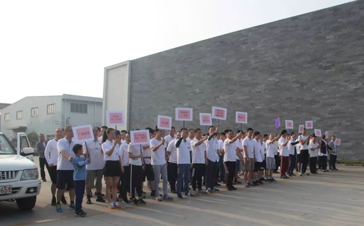 準備出發(fā)~,公司職工身著整齊的白色T恤,組成整齊劃一的方陣,昂首闊步向前奔跑,以堅定豪邁的步伐奔向“錦犬”之旅。